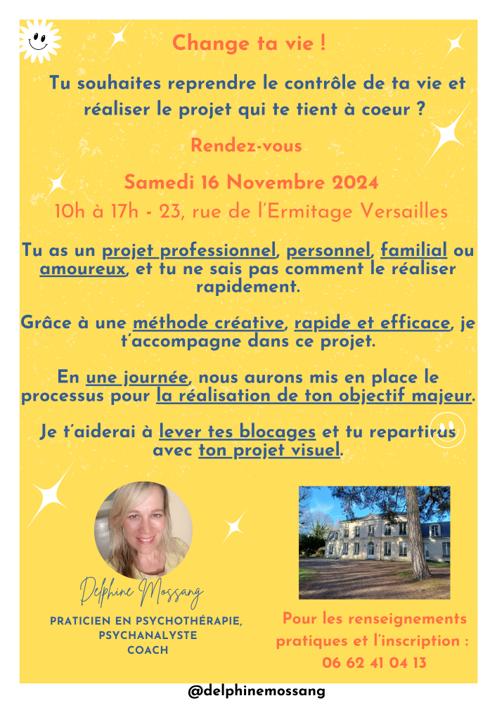 Un coaching créatif et thérapeutique pour atteindre vos objectifs rapidement à Versailles avec Delphine Mossang.
